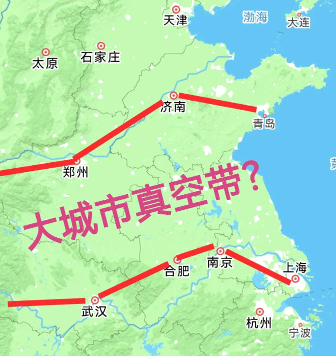 南边是上海-苏无常-南京-合肥-武汉这一条线;北边是青岛-济南-郑州-西安这一条线,这两条线上都是大城市,两条线之间的淮河流域广大地区,0省会城市、0万亿GDP城市。